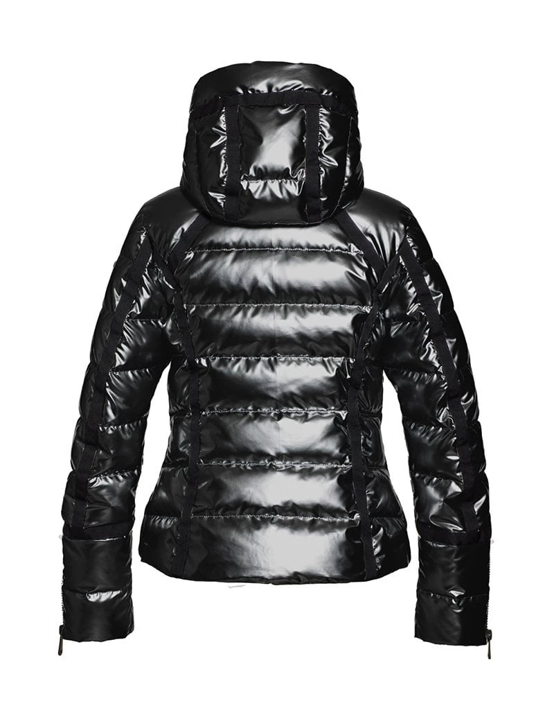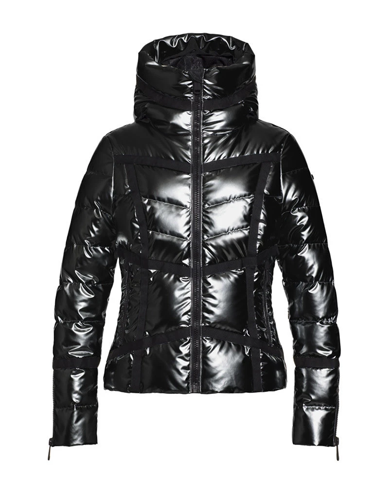 Het is een high glos donsjack met een grafisch lijnspel. De jas heeft een hele mooie